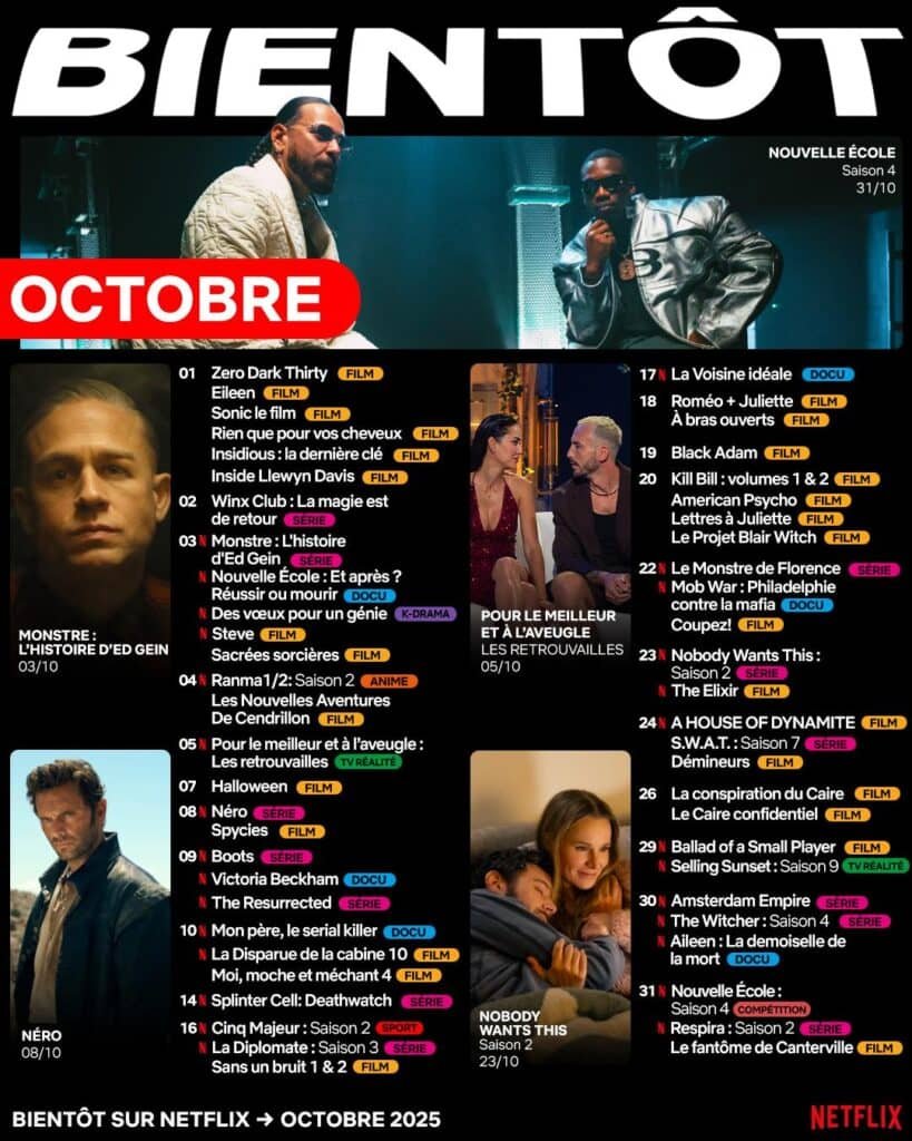 Octobre 2025 s’annonce comme un mois riche en émotions pour les abonnés de Netflix. La plateforme de streaming nous réserve une sélection captivante de films et séries qui raviront tous les goûts. Des thrillers haletants aux comédies légères, en passant par des drames à couper le souffle, il y en aura pour tous les passionnés de séries et de cinéma.